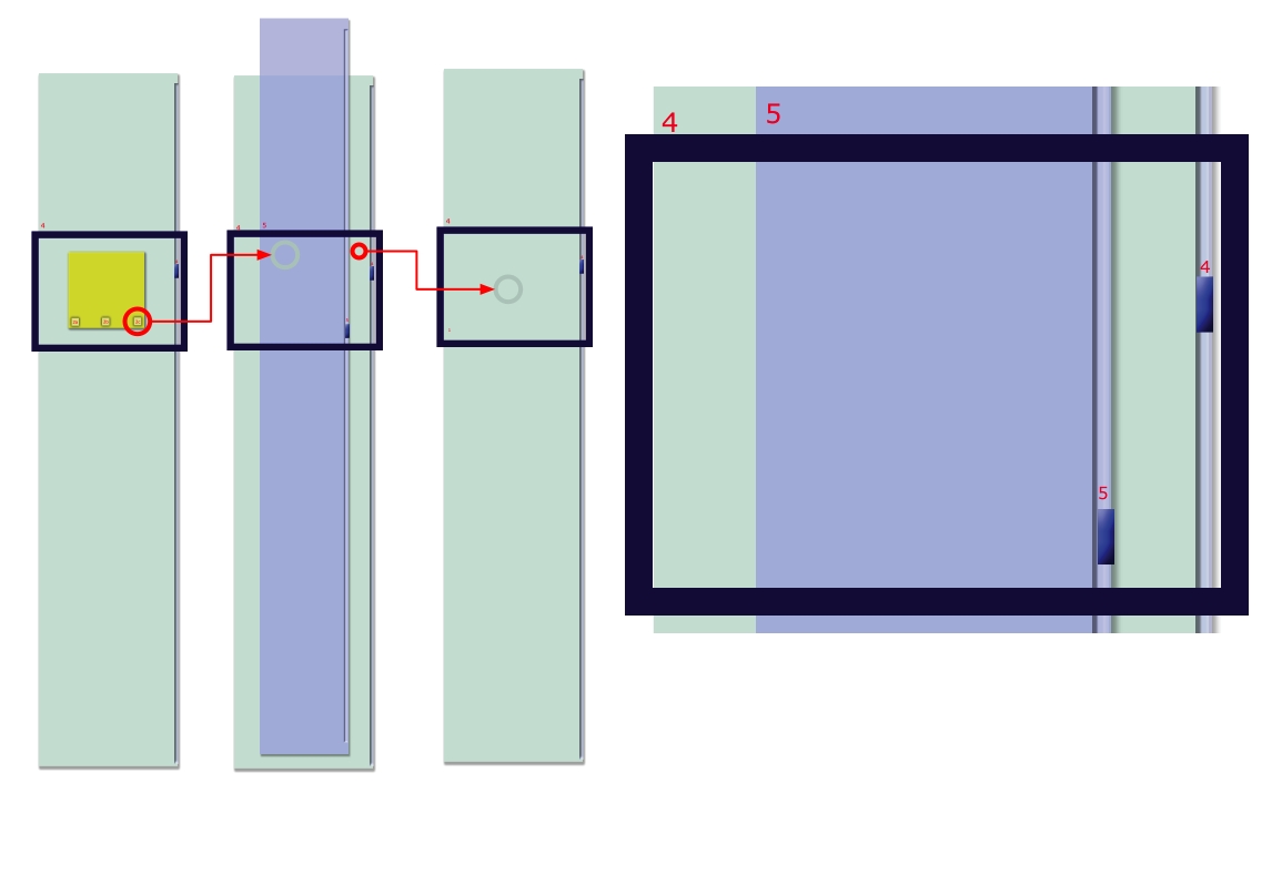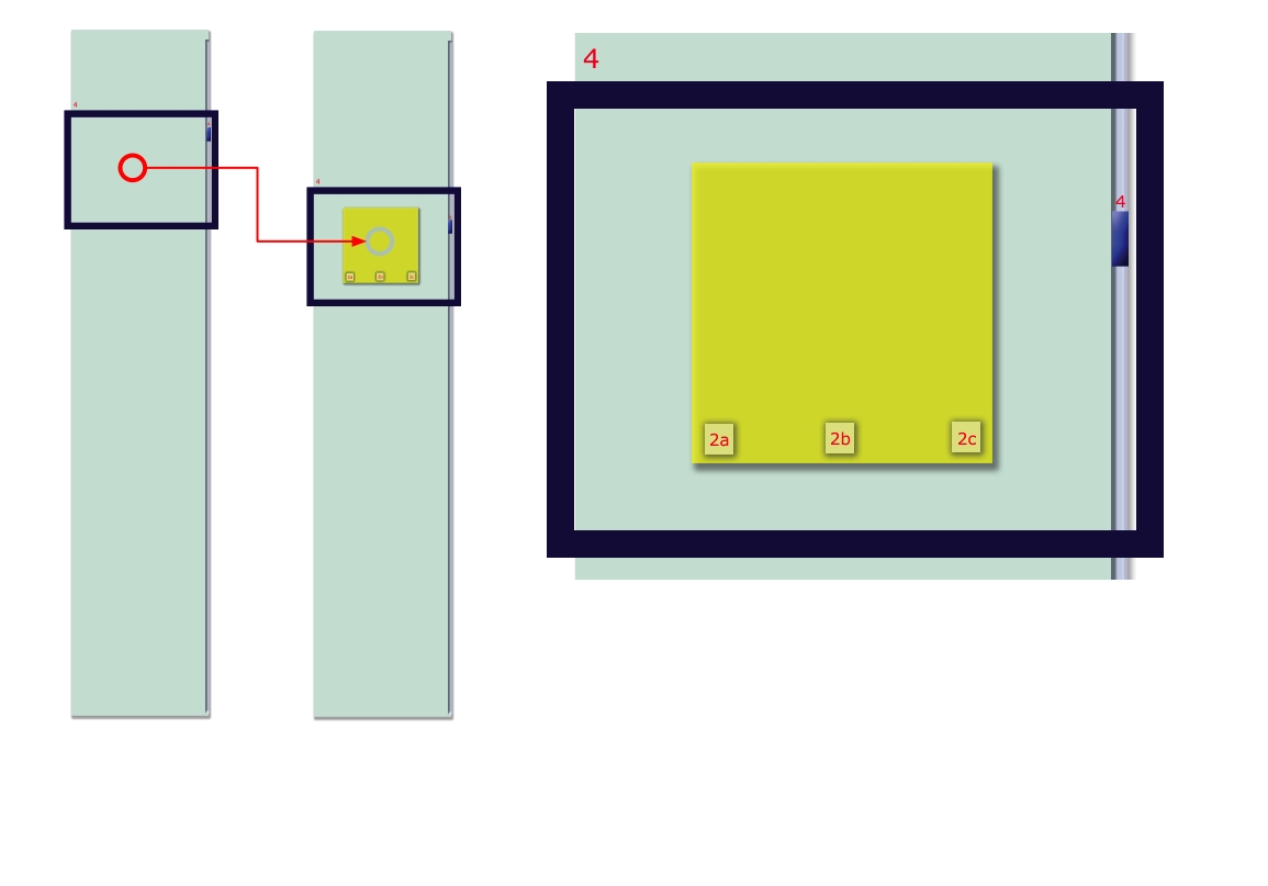 6 Another situation whereby the user selects a button on the overlay (yellow) to go to a specific point in documentary layer information related to a specific position in the vertical presentation scroll. The user can (if wanted) continue other documentary information elements in the vertcal documentation scroll, or click on the pane of the vertical presentation scroll (green) to go back to the same position last visited (the vertcal documentation scroll goes out of view) ...