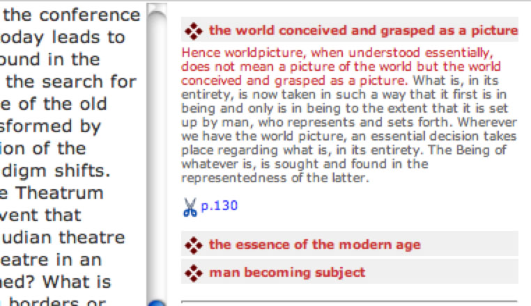 9 Another example where a documentation layer in the form of a vertical screen appears over a vertical presentation scroll. This documentation layer is in a format with the following functions: 1) book cover; 2) bibliographical information; 3) links to libraries that have a copy of a book or other information object; 4) quotations that are summarized in short headings (monades that represent the core element of a longer quotation); 4) a link to a horizontal documentary layer with visual quotations from a publication. All the monades (quotation headers) are in a list at the top of this bibliographic format. The user can click a specific line and jump down to a specific quotation further down, and vice versa jump up again to the list of monades.