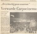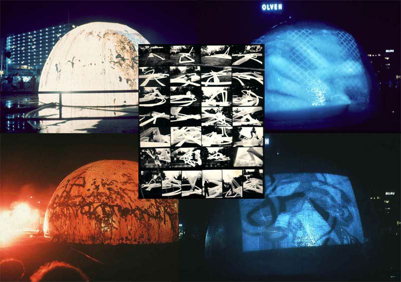 ![]() what A big size inflatable transparent dome as a living screen for movie projection, displayed as a free for all show, at public squares in Amsterdam and Rotterdam. Different substances and techniques were used to create dynamic projection surfaces, with smoke, white inflatable tubing, foam, paint, jelly, powder and water sprays. Projections on the dome were combined with lighting effects from the inside of the dome and the use of pyrotechnic devices that reflected on the outside of the dome. Projections were done from three sides with high capacity film projectors. A mix of movies was shown: promotional films for products like washing powder; documentary films about racing cars, moon expeditions and American airforce activities; comics and other children films; and experimental films like the racing colorful stripes of Mc Laren and the stroboscopic flashings of the Continuous Movie. There were also day events whereby the acoustic properties of the dome were tried out by The New Electric Chamber Music Ensemble, combined with paint and foam sprayings on the outside of the dome (using an elevator truck to access the upper parts). why Quotation from Sigma Projects leaflet( August or September 1967): “CORPOCINEMA Theo Botshuiver, Jeffrey Shaw Corpocinema is a semi-spherical pneumatic structure designed to materialize projected images through space in conjunction with a program of corporeal event phenomena within. This signifies a reconstitution of conceptual situations (film) in real time (event structure).” Quatation from a draft text, probably for a press release September 1967: “The program was in Amsterdam was realised with the collaboration of Sean Wellesley Miller.” Follows an end note: “In effect this project indicates an extensive area of event/film (corpocinematic) reserach which is now being undertaken by Th. Botschuijver and J. Shaw. The inflatable device made for Sigma-projects is the first public manifestation of the initial results of this reserach program.” NB spelling as in original. how ![]() |