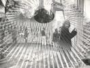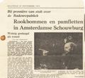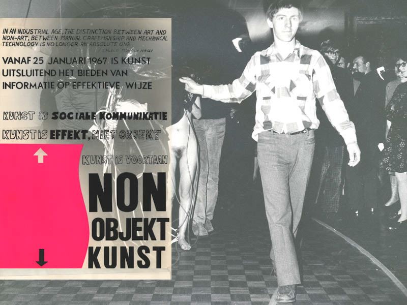 ![]() what An evening with a series of happenings in the municipal museum of modern art in The Hague, or in the words of the participating ‘Ontbijt op bed’ (breakfeast in bed) group from Maastricht a confrontation with: “non-object art”. The part of Tjebbe van Tijen had the following suprises: jazz musicians playing and parading in an inflatbale costume for heads; the continuous drawing growing over floors, walls, musicians and a naked lady; threeD drawing with spray can foam; and nuts (nuts is ‘noten’ in Dutch, also meaning musical notes) being thrown around by musicians and taken away by vacuum cleaning. Descritpion of other events at this can be found in Museum Journaal article (see column at your right hand). |