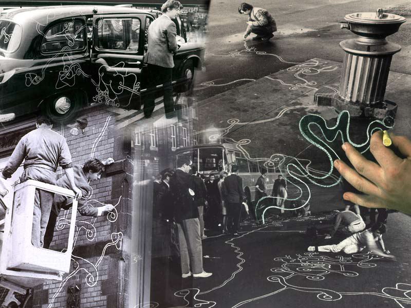 ![]() what A branching drawing system of abstract organic forms going over any surface made mostly with perishable materials like chalk and wax, starting from holes, wells or other fluid surfaces and continuing its parcours for several hours. It has a set of strict topological rules and can be made by several drawers at the same time. The drawing system can be learned by following a correspondence course and some days of practical training. The drawing appears and disappears at several occasions, in buildings, out on the street, through the pages of a magazine and its longest stretch realized is when it grows from London to Amsterdam and Rotterdam hopping on persons, taxis, in an airplane, over the passengers, up the wall of the Stedelijk Museum Amsterdam and the next day disappearing in a smoke projection in Rotterdam (see Corpocinema). why The correspondence course for continuous drawing was a kind of pastiche of the American course called “Famous Artist School” (a Dutch version of this course also existed), combined with all kind of pompous art history texts. The following is a quotation from the “foreword to the second revised edition” of the continuous drawing course: “Before modern art made a complete breakaway from the easily recognizable pictures, right at the very beginning something was developing that did not entirely deny naturalism but nevertheless criticized it in a sense. The form was not represented is a ‘chance’ form but stylized into a type of form. This is an expression of one of the most widespread human desires, the desire to regulate and sum up the outside world by means of a small number of universal systems and formulas. In other words: One wants to reduce the many individual forms to one simplified average form in which one can no longer distinguish the individual peculiarities but only the type, the sort. A desire that has its parallel in nature itself: Nature is not concerned with the existence of the individual but only with the survival of the sort. Every stylization is based upon the recognition of the true essence in many various forms of the same sort and their reduction to a basic geometric pattern. This form is imprinted upon the memory and is an easy basis for all kinds of individual variations. Ornaments, if they have passed through real stages of growth are always essentially derived from a form of nature, a plant, a man, an animal, or an instinct, a movement that perpetually repeats itself. There is not always a logical explanation, one must simply learn to sense things for himself. The ability to absorb impressions transformed into systems and symbols and to instantaneously attach a whole chain of thoughts and emotions to them is a specifically human ability. IN THE BEGINNING THERE WAS THE LINE.” NB the course was going to be published in English, but this failed because a Flemish printer where it should be printed refuse to do it because of pictures of a naked girl (Saar Stolk) covered by continuous drawings. The full English translation does exist and will at some state be put on-line. how ![]() |