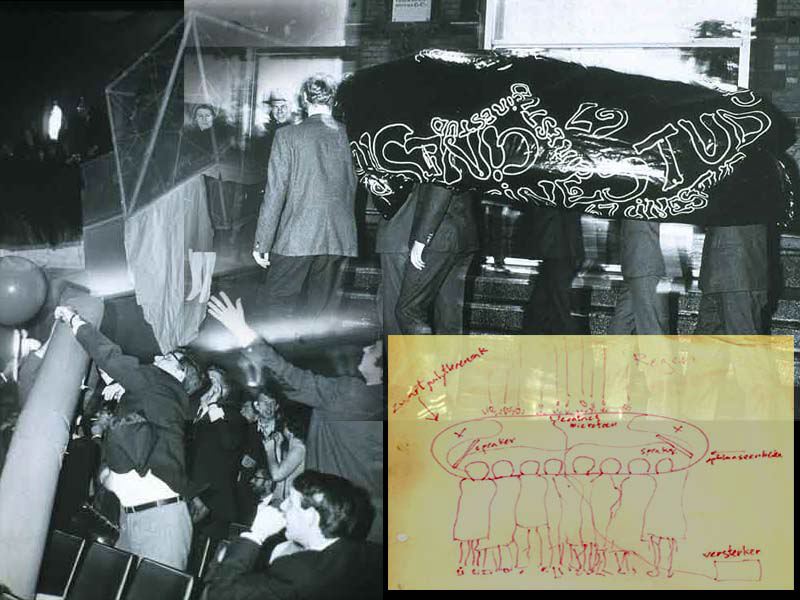 ![]() what A ‘collective head costume’ consisting of a big inflated black amoebic bag, where six persons can stick their head in, is worn by the organizers of the yearly student film festival Cinestud when they attend the new year reception of the maior of Amsterdam in the local museum of modern art. The name of the festival is written in white letters all over the head costume. At the closing evening of the festival films are projected on a screen that is made of paper boxes filled with rolls of plastic tubal foil that starts to inflate during the projection, bursting through the paper into the audience. Also over the heads of the audience such boxes are hanging filled with white weather balloons. The audience grabs and jumps enthusiastically at the inflatables and becomes part of the expanded cinema event. |