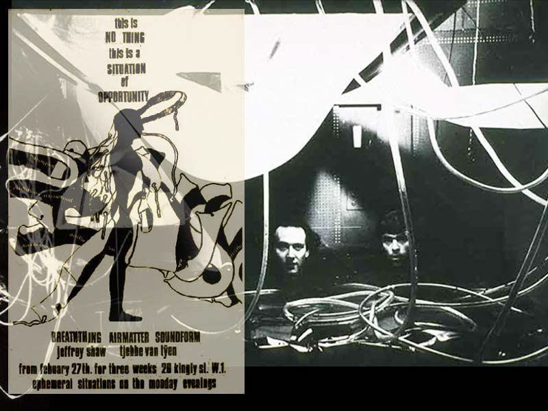 ![]() what A show with installations, environments and a series of events in an experimental art space in one of the ‘hip’ streets of West End London in the mid sixties. The environments for heads by Tjebbe van Tijen was a fixed construction in the gallery where the spectator could enter only with the head. The space thus entered was black and full of tubing filled with air and floating liquids, a very slowly expanding water basin with seeds growing in wet cotton, and a bunch of beeping and tootling child toy whistles fixed to the air outlet, the sound of dripping water could be heard as well. There were headphones for each visitor with different sound tracks (some with nice music, others with insulting language) so the facial expression of the spectators might differ. The loss of body proportions by just seeing heads added the estranging effect. Jeffrey Shaw had as one of his installations a projection screen made out of surgeon’s gloves, that could be inflated - by a user - in diffrent ways though a simple air foot pump (see Event Appendix for details).. how |