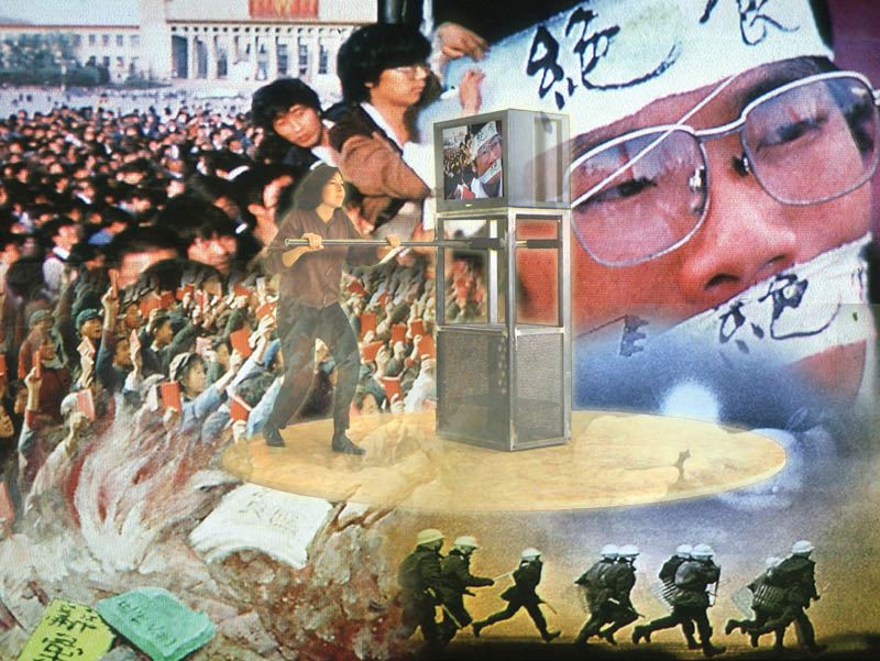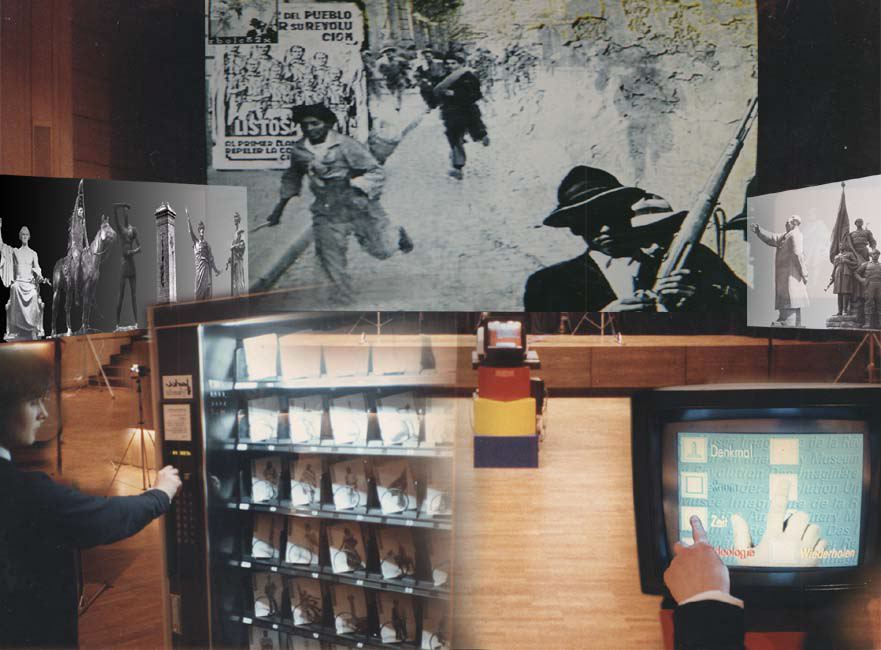 ![]() what The commemoration of the bicentenary of the French revolution of 1789 in 1989 led to this installation in which two hundred years of ‘revolutionary moments’ from all over the world are to be represented by two hundred replicas of monuments and sculptures that directly or indirectly represent a revolution. These monument replicas - all made to the same size (slightly bigger than an average human) - will be brought together in one place where visitors can walk around them and trigger revolutionary songs by touching a statue. In the middle of the terrain where the monument replicas are placed is a circular transparent enclosure with a at the entrances dispenser machines where one can buy mini replicas of the revolution monuments. Inside the enclosure there are several interactive (video-disc) installations, each with several screens and a sensor on which a chosen mini-replica - that represents a specific revolutionary moment - can be placed. By way of a touch screen the visitor can, starting from the chosen revolution, travel in time space and ideology. Short ‘tableau’ like depictions and textual descriptions are displayed and also one can hear a revolutionary song belong to a chosen moment, portraits and biographies of related personalities are displayed as well. One can see which revolutions happened in the same period, or in the same geographical area. An icon based classification system shows the ideological components of each revolutionary moment through three elements: actors, actions and motifs. Revolutions with the same classification can be chosen or one can decide to follow only certain specific historical moments, like peasants as actors, or military as actors. This project proposal was submitted to an official French competition for the ‘commemoration du bicentenaire de la révolution Française’. The ‘Imaginary Museum of Revolution’ project was chosen as one of ten projects that should be realized. Sadly this failed because some officials on the commission did not appreciate the fact that in this project ‘La Grande Révolution Française’ was shown as just one of many revolutionary moments in the world. Also the costs of a full realization of the project would have been very high. Because the project almost materialized, many parts have been actually realized, like the database with over 2000 revolutionary moments, a research on possible sculptures and how to make the replicas. The full project proposal has been exhibited in Paris and a first public tryout of some p[principles has been shown in The Hague. The Brucknerhaus in Linz, Austria was the first serious financier of the project, making it possible to produce a first pilot version. Several compromises had to be made to make this pilot, so instead of monument replicas there were panoramic photographic scrolls and postcards with barcodes were used in the dispenser instead of mini-replicas. The historical research has later been recycled as a book on two centuries of revolutions, and the tableau-images of revolutionary moments were reused in a video-sculpture named ‘Revolution’. why Revolutions can be grouped in extremely diverse ways. Each individual‘s conception of society and its history defines a way of grouping these events. It may involve slight distinctions between closer related concepts such as insurrection, riot, rebellion and revolt or diametrically opposed interpretations of the same event such as revolution and counter-revolution. The same forms can acquire completely different meanings in other places and at other times: army mutinies, banditry or guerillas, civil rights movements, boycots or civil disobedience. Independence, national unity or secession can all be viewed as being revolutionary. The concept of constitutional revolution indicates the regulated construction of a new order whereas other revolutionary movements want to create their new society out of the actual process of destruction. Non-European history is even more confusing. For instance, when should the fight against Europeancolonialism be called revolutionary? And shouldn’t the countless slave revolts and wars between the marrons and their former masters now be considered as being revolutions rather than allowing j‘ust one single case like Haiti? The closer an event is in time and space, the more critical one is of the application of the word ‘revolution‘. Understandably many reject the use of this word in terms of fascist movements as led by Mussolini and Hitler but these movements do conform to definitions of ‘revolution‘ as being ‘any large-scale process of change‘ or ‘the overthrow of a society‘s dominant value system‘. Not everyone feels that the concept of revolution need be limited to that of a complete revolution within a society, rather it can also be applied to short-lived and less all-embracing historical events. In our opinion, commemorating the French Revolution implies that this arena of debate, of differing opinions and conflicting ideas must once again be broached. By showing different kinds of revolutions world-wide, from different areas and including their various interpretations, the authors of this project wish to express the multifaceted aspects of the concept ‘revolution‘. how ![]() |
