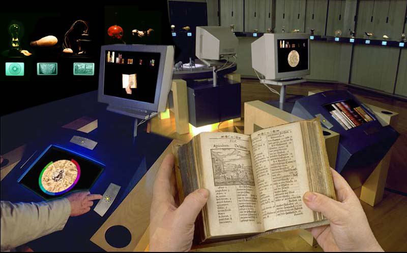 ![]() What Looking & Pointing, an interactive computer installation starting with the original edition of the Orbis Sensualium Pictus, showing how the depiction and description of the world for children and in educational books changed, from the sixteenth century till now. Books from the end of the sixteenth and beginning of the seventeenth century that were a source of inspiration for Comenius are combined with books inspired by the ‘Orbis Pictus’ published in the following four centuries. A total of twenty books, all original editions, coming from five different European libraries can be looked at and compared in detail in digital form. The searching system is entirely based on images and spoken word and its function is to facilitate the comparison of the different books, its plates and details. This part of the installation has two big monitors, one placed horizontal (the touch screen), the other vertical (navigation screen). Touch screen: Choices can be made by pointing and touching of parts of the pictures on the bottom screen (touch screen). The installation speaks three languages that can be chosen by touching the colored circles at the bottom of the screen: Latin (blue), Dutch (green), English (red). Navigation: At the left and right of this touch screen there are metal plates that react to a short and light touch of the hand, by touching these switches you can move back and forward through time. In the same way the switches at the top and bottom of the screen let you go through different levels of information: bookshelf, book, chapters, subchapters, tableaus and details. Little lights in the switches indicate which navigation options are available. You can use these switches only when they are lighted. Navigation screen: On the top navigation screen you can always see the available books in chronological order by year of publishing. On this screen you can see where you are: in which century, book, chapter, subchapter, page, tableau or detail. Graphic representation: The book as a visual object forms the basis of the navigation system. The back covers of the books can be perused on real scale (some books go off screen because of their size). The content of the books is represented chapter wise in segmented diagram circles (we called them Fludd circles after the 17th century English physician who developed this system for his books on the macro and micro cosmos). Once a chapter is chosen, subchapters appear also in circles with pictograms representing each singular section. The singular section mostly consist of tableau like representations of the human world. Details from these tableaus can be chosen as well, which are enlarged so one can study the depiction in great detail. Spoken languages: at each level of navigation speech is triggered by choices made on the touch screen. These can be the title of the book, a chapter, a tableau or a detail of an tableau. Details are either singular words, or words set in a short definition like sentence. As said three languages can be accessed. There have been two editions of the installation, the one shown in the Netherlands spoke Dutch instead of German, though of the Orbis Pictus itself no Dutch version existed. For this reason a reconstruction of seventeenth century Dutch has been made, facilitated by the fact that Comenius during his long stay in the Netherlands had published similar teaching books with Dutch words and sentences. The Latin language was spoken by a specialist in Neo-Latin. Why The installation is based on the book Orbis Sensualium Pictus (the world explained in pictures) by Comenius. The first version was published in 1658 in Nürnberg in a German/Latin edition. Comenius is the Latin name of Jan Amos Komensky, born in Nivnice near Uhersky Brod in Moravia 1592, deceased Amsterdam 1670 and buried in Naarden. The Orbis Sensualium Pictus is a playful and visual textbook to learn Latin and other languages. It summarizes the whole world in hundred and fifty pictures (tableaus) with titles (nomenclature) and numbers that point to words that are set in short sentences. Almost two thousand words and notions are explained for children in this compact little book. In the past three centuries more than two hundred editions in twenty six languages, that used the Orbis Sensualium Pictus as a model, have been published. Things, phenomena and notions are shown in the seemingly natural context of landscapes, still lifes, schemes or allegoric images. Most of the tableaus represent concrete and tangible things. The seventeenth century tableaus look like modern computer screens with 'hot spots' that can be clicked with a mouse or be touched to set an event in motion. The exhibition Orbis Pictus Revised joins this seventeenth century 'multi media' book with today's modern technology. The project has in fact been started by Milos Vojtechovsky who was living at that time in Amsterdam where he had a small galery ‘Oko’ (eye). In the early nineties of last century he made a whole series of associative assemblages of all kind of left overs and scrap materials, which were all inspired by one of the 150 tableaus in the litlle book of Comenius. A first exhibition of these assemblages was documented by Milos in a handmade book, which showed the tableaus and texts that inspired the assemblages. At the end of this book Milos has one quotation that summarizes his intend: “ln every human being there is a strong methaphysical desire to create a reality structured through images in which objects become meaningful through vision and which does not, as Max Planck believed, exist because it is measureable.Most of all, the question of imagination and ideas as an instrument of thinking and analyzing has occupied artists and philosophers. Only in more recent history this process of thinking has been undervalued because of the predominance of quantitative and materialistic criteria. It is obvious, however,that what we generally call thinking is nothing el