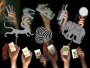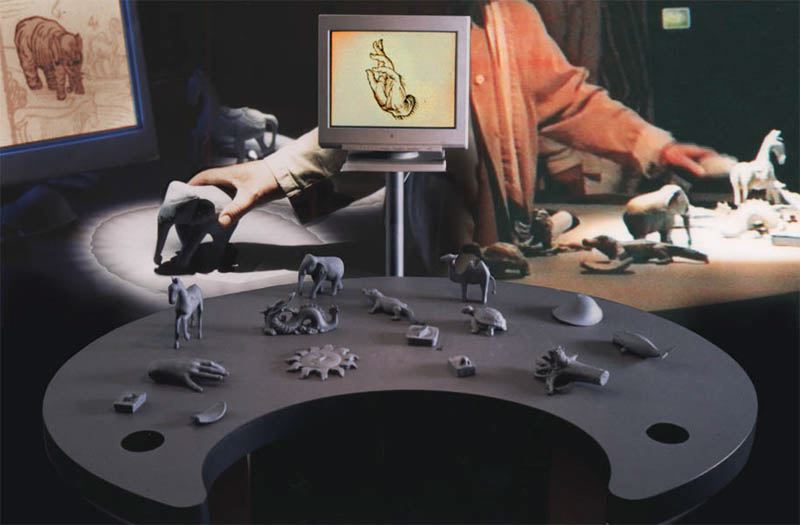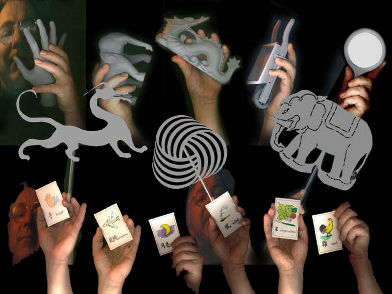 ![]() what The installation has three movable elements and one fixed element. The movable elements are: hand size objects, shadow figures, and playing cards. Of each of these elements there are 50 or more. All these elements have embedded radio-like sensors (transponders). The fixed element is a 'magic mirror' that can "read" the movable elements and according to what is presented to it can display different sequences of sound and images. The movable elements, objects, shadow figures and cards are placed without any order around the magic mirror. The users of the installation can play this language game by picking up the objects or other elements and move them in front of the magic mirror. objects as words for things ... a quantity of fifty or more objects depicting things from the real and imagined world like animals, plants, human body parts, vehicles, tools, mythical and cartoon figures, symbolic representations. These objects have originally been made for different kind of use: toy, souvenir, decoration, instruction... They are all somewhat similar in size and their original colors have been covered with a gray layer, emphasizing their tactile character. The objects can be either directly on the floor or on low plates or carpets. They are not in any special order, the public can pick them up at will and put them back where ever they like. Each of these objects has a 'transponder' embedded that will trigger an audiovisual event when the object is held at a close distance of the magic mirror. words as shadows of things ... a quantity of fifty or so pictogram like cut outs/schablones of a sturdy grayish material, fastened to a thin long stick are placed in holders. The schablone images can be of different origin: silhouettes of real things, heraldics, emblems, family crests (kamon), modern pictograms and other elements of the historical vocabulary of visual language. In the middle of each schablone a thin and flat transponder is attached. By holding the schablone in front of the magic mirror sound and images will be triggered as described before. questions giving meaning to words ... small hard cards are set in boxes at both sides of the Sensor/Display (4). These cards can have words, pictures, symbols that link to the objects or shadow figures. They can be picked at will and held at the center of the magic mirror. These cards have transponders as well. Once sensed they will trigger sound or image events that will prompt the public to answer by picking up either an object or shadow figure. Questions can be real sounds of beings or things, onomatopoeia, words spoken in different languages or symbols. A wide scala of such 'questions' can be imagined with both simple and more complicated ways of answering (finding and sensing single Objects and Schablones, or searching for groups that match). These questions will be pre-configured but one can easily imagine an extension of the installation whereby the public, on the spot, can formulate questions themselves and instantly store them in a 'Question trigger card' (using a console with a card reader/writer or another kind of interface). answers that raise new questions ... the magic mirror that functions as both sensor and image and sound emitter, is hanging free in the middle of the space. It will react to the communication with objects, shadow figures and playing cards. These reactions can be both answers and questions. Technically it consists of a circular glass plate (approximate 1 meter), suspended from the ceiling, on the outside a thin coil of copper wire embedded in the glass and the inner part of the glass plate matted to function as a back-projection surface. The glass plate is also used as a vibrating sound emitting surface using a special kind of small contact-loudspeaker. When a hand size object is held in the center of the glass plate, the embedded code of that object will be sensed by the embedded antenna and its unique code transmitted to a computer that will activate related sound and image events. Except for the glass plate, its suspending wires (that can be also be used for the necessary data transfer) and the small size contact loudspeaker, no equipment will be visible. Projection on the center of the glass plate will come from a LCD projector positioned on the ceiling (or floor) using a special mirror that is positioned at some distance at the heart of the circular glass plate. The computer will have a database with all the unique transponder codes of the Objects, Schablones and Question-cards. It will link instantly the specific image and sound sequences. Without going in much detail now, a short list of possible sequence elements can be given: real sounds of a thing or being; sound symbols/onomatopoeia; name or other brief description; definitions from different times, cultures, sources; symbol for group of things/genera; series of images of members of such genera (dog/dogs, chair/chairs, tree/trees, ear/ears); taxonomies in which single things/being are classified (tableau's/diagrams) different allegoric representation of things/beings in heraldics, emblem art, comics. why This project design was made after I received a demand from the new media center in Sendai in north Japan that opened in 1999/2000. There seems not to have been sufficient money to commission this project, so it has remained just a proposal. The following is taken from the original proposal: The idea of having hand size objects as an interface to trigger image and sound sequences (as in the table interface in the Orbis Pictus project), will come back in a different form. I used the same technical principle of object sensing in a more recent installation on shamanism (with different stones and fossils as an entry to narrated creation myths; a project together with Fred Gales). A study, last year, for an essay related to the work of Agnes Hegedus on personal memorabilia (Artintact no.5) has stimulated my interest in, and deepened my understanding of the 