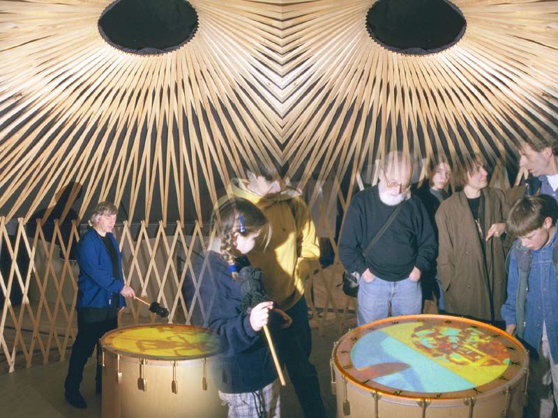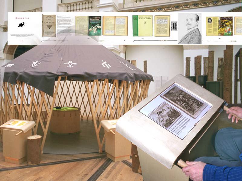 ![]() what "The true source of religion", a design for an installation for the Berliner Festspiele exhibition in the year 2000 called "Seven Hills - Images and Signs of the 21st Century" (In the end the project has not been realized because of insufficient financial resources). This installation recycles some elements from the Neo-Shamanism installation. The design was for the Schliemann Hall of the end of the 19th century Gropius-Bau in Berlin, a huge space once dedicated to the (debated) treasures of Troy found by Heinrich Schliemann. The floor of the space was planned to be covered with sand with drawings/patterns from different cultures of the world. The public could move through this space by walking on a spiraling path of stepping stones. These ceramic stones would each have the picture of a religious or scientific diagram, thus make the visitor step through millennia of human ideas. The following text is taken from the original proposal: Lay down in a hammock, from which rivers of white light flow, and dream away, rocking to and fro in an ocean of sound. Touch the loom of god and see how heaven and earth are woven together by patterns of light. Feel the traces in the sand, temporal signs of eternity; step from stone to stone on a path leading to sacred and scientific insight. Hit the drum and call the messenger, let him show you the sixteen ways of the shaman. Put a petrified object on a magic mirror revealing different parts of the mythosphere. Try to unravel the outdated messages in knotted cords and guess the opened ended questions in unconnected wires and cables. Enter the yurt, a network of woven wood, recite the barcode mantras, connect to myriads of belief on the World Wide Web. Unroll the scrolls, be iniated in the sources of shamanistic knowledge. why The theme of the part of the exhibition which we were commissioned to make was: the Oceanic Feeling. This notion comes from the correspondence of Sigmund Freud with Romain Rolland: "A feeling as of something limitless unbounded -as it were oceanic a sensation of eternity" Freud summarized a passage from a letter written to him by the French writer Romain Rolland in a reaction of Freud's interpretation of "religion as an illusion" (The Future of an Illusion, 1927). Rolland agreed with Freud's judgment on religion itself, but thought that Freud had not properly appreciated "the true source of religious sentiments", after which follows Rolland's description of what came to be known as "The Oceanic Feeling". |