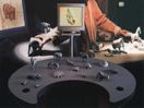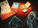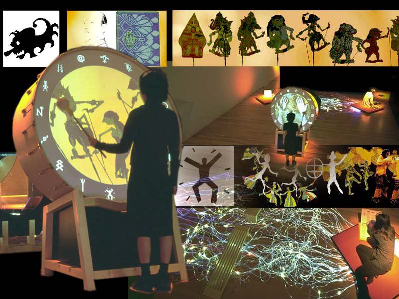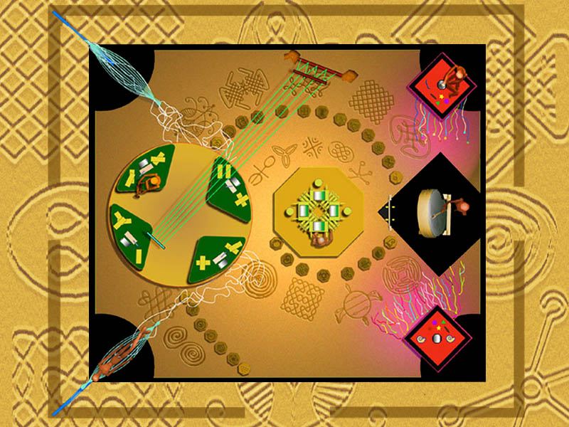 ![]() what The work reviews historically different forms of shamanism - one could say a non-electronic form of telepresence -. Fibre information systems from the Inca age 'quipu' to glass fibre cables mark the space in which a big drum is standing as the main interface. Two other interactive installations give the opportunity to relate information on the Internet on shamanism with stone age creation myths. The drum is not a 'mock up' but a real percussion instrument with a special prepared drumhead that serves also as a projection screen. Also there are the sixteen pictograms, printed on the drumhead at regular intervals around the border. The pictograms represent the different sequences. By hitting a pictogram with the (special) drumstick a sequence is chosen. The first image will be an enlargement of the pictogram with a spoken short title of the sequence. The sequences are long picture collages that scroll in different directions through the circular space of the drumhead and have a length that varies between one and two minutes. At any moment the user can switch to another sequence. The catalogue of the exhibition had a kind of poetic description of the functioning of the installation: There is another realm at the other side of the stream of messages contained in knots and flashes, traveling at the speed of running and light. Fibres of cotton and wool, of copper and glass, are twisted in pairs, connecting the ongoing search for meaning in life, from stone age to cyber age. Take off your shoes. Sit down on these islands of unspun wool. use the mysterious coil and magic wand to decode questions embedded in stones an barcodes... Who are we? Why are we here? The answers given in creation myth. Myth organizes the way we understand ourselves and the world, but these original myths, from different cultures, hardly survive the globalization process of our age. We can re-create our understanding of the world by comparing these different myths, extracting the archetypes, discovering the similarities of views from a variety of viewpoints. This gives the opportunity to redefine value structures, create a new unity of spirit and matter, mind and body. Myth is kept alive through ceremonies and rituals. The shaman is the creator of ritual. By turning inward the shaman can reach outward into other realms of existence, being the messenger between this and the other worlds. If one wants to learn about these spiritual methods one has to cross the bridge. step over the abyss. enter the sanctuary within the magic circle, and call the shaman messenger with the sound of the drum. You will be shown sixteen ways of the shaman as seen from different times and cultures, in perspectives ranging from belief to disbelief. Thus hidden spirits become visible in a mirror casting their shadows on the skin of the drum. why The exhibition “Portable Sacred Grounds: Telepresence World” reviews telepresence technology and its concept from the viewpoints focused on the nature of "collaboration", "memory and unconsciousness", "spiritual exchange", "primitivism", "multilayered reality" and "sacredness" to discover a new vision of the world. It proceeds through information space and present new form of sacred grounds such as "remote coexistence" where participant accesses to a virtual space to foster a new world and "telepast" where past and present resonate together. Participant will experience the fascinating world of images where boundaries - as for West/East, past/present and interior/exterior - do not exist. There were four works: - "Terra Present / Terra Past" 1998; ART+COM - "The World Generator / The Engine of Desire" 1996 1998; Bill SEAMAN , programmer Gideon MAY - "Garden of Memory" 1998; MINATO Chihiro , MORIWAKI Hiroyuki - "Neo Shamanism" 1998; Tjebbe VAN TIJEN , Fred GALES |