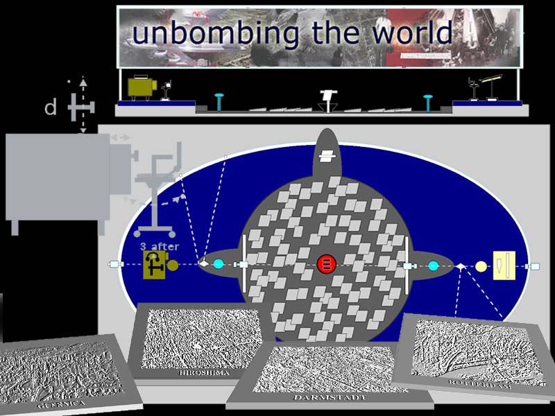 ![]() what Condensing the complex issues of almost a century of aerial bombardments and the targeting and hitting of humans and human habitat, by juxtaposing fragments of historical documents relating to the different actors in this theater of war, both perpetrators and victims: politicians, civil servants, scientists, industrialists, military personnel, civilians. Choosing a significant number and a representative variety of bombed cities from the complete list of approximate 400 towns in the world that have been bombed in the last 90 years. Dramatizing the historical documents that belong to the chosen examples, by using interactive audiovisual media. With each chosen dramatized example, showing comparable examples (just in text form, diagrams or maps) from the complete list, to make the magnitude of destruction always understood. Letting the voices of the victims of bombing be heard by quoting from the vast arsenal of personal accounts that have been published the last nine decades in different countries that have suffered bombing attacks. Making a choice of such writings and translating them in the languages needed in the country or countries where the installation will be shown. Setting up an international network of concerned people: archivists, artists, people who have witnessed a bombing, local journalists, peace activists, translators, photographers, etc., who will share their knowledge by adding it to a public accessible database which will be made available over the Internet. Interfaces: Stones Bureaucratic procedures for choosing targets can lead to the actual destruction of human habitat. High technology is used to bomb people back into the stone age. Images of this destruction, frozen in engraved tombstones, can be personally captured. Rubbings made on paper with charcoal can be taken home. Before proceeding to the other parts of the installation you can wash your hands in 'innocence'. Desks There is an inescapable relation between the targeting and destruction of the human habitat and the reconstruction afterwards. However devastating and cruel the attack, none of the towns bombed by modern technology have been wiped of the face of the earth definitely. The office-desk and the drawing-table are the two symbols that stand at the beginning and end of this process of destruction and recreation. They are the interface to interact with the vast amount of digitized historical data. The office desk stands for the bombing and the architect drawing table for the reconstruction. Sitting at an office desk with drawers full of files with the names of target cities and target areas. Going through these files, taking out one, opening it and study the details. Opening the other drawer of the desk and going through the arsenal of possible weapons. Choosing the right weapon that belongs to how the chosen target fits in space and time. Bombing the target and turn around on your office chair, looking to what was there before and what after. Having the opportunity to turn away from the desk, asking yourself: "what have I done?" Sitting at the drawing table of the urban planner, making an inventory of the war damage, thinking up new plans, deciding what to keep, what to knock down after all. Turning your chair, looking at what was before, at what came after, maybe turning around and ask yourself: "what have I done?". By pointing a hand size symbolic model of an airplane up and down, the visitor can listen to narrated fragments from those who were bombing and those who have been bombed. In a similar way, at the drawing table, the visitor can listen to stories of both the planners and the ones that have been planned, by moving a special drawing pencil up and down over the table why The idea for the Umbombing Project came after a visit to Tokyo in 1995. At first I could not understand why only such a few older buildings and landmarks could be seen, and I was shocked to discover that a great part of this huge city had been torched and burnt down during aerial bombing campaigns of the USA Air Force in March-July 1945. I was ashamed not to know that over a hundred thousand people died, probably more than the death toll taken by the atom bombs dropped on Hiroshima and Nagasaki in August 1945. As 1995 was the 50 years anniversary of the dropping of the atom bombs, an international debate arose. A discussion partly triggered by a proposed exhibition in the American Smithsonian Institute of Technology of the airplane that dropped the atom bombs, the Enola Gay. (...) 1995 was also the year in which discussion lists on the Internet started booming and many people from the USA, Japan, the world over, used this new discussion medium. The discussion was marked by an obvious split between right and wrong, victors and defeated, aggressor and counter-aggressor. It did not sufficiently address the wider problem of the use of aerial bombing: ways of waging war whereby civilians run even more risk to be killed than soldiers. The Unbombing Project is an attempt to go beyond the dichotomized way of discussing war. It raises questions on the massive use of air power during World War II as a means to defeat Nazi Germany, fascist Italy, and imperial Japan (it certainly does not fail to document the indiscriminate and vicious attacks by the air forces of these Axis countries); it raises questions on the practice of "terror-bombing", not aimed at military or economic targets, but at the morale of the population, and thus at their lives. A military strategy that has not sufficiently been put in question, and even continued during the Korean and Vietnam/Indochina wars. The post World War II international tribunals of Nuremberg and Tokyo failed to address the issue of aerial bombing and the hundred thousands of victims it caused. This has left a moral-vacuum, especially on the side of the British, the Americans and allied countries that had a major involvement in the air war (Canada, South Africa, Australia). This moral-vac