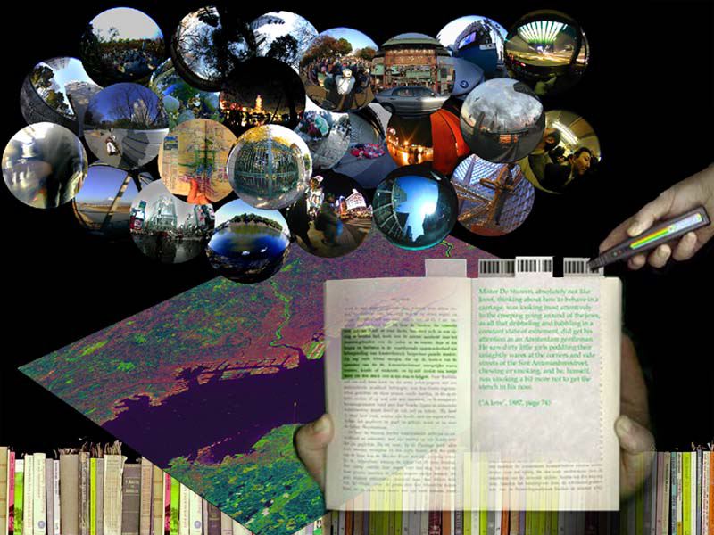 ![]() what Psycho-geography is the art that tries to record and understand the influence of the outer environment on the human mind and vice versa. Literary psycho-geography is the expression of this phenomena in literature, whereby literature is taken in its widest possible sense: any writing that manages to capture the influence of a particular part of a city or landscape on the human mind, or a person's projection of inner feelings or moods onto the outer environment. Well versed literary texts, poetry, novels or theatre plays, but also popular fiction, comic books, journalistic writing, songs, films, official reports and advertisement slogans, all these can have fragments or passages that capture 'psycho-geographic moments' in descriptive text. All these scattered text fragments, when put together, will make it possible to 'read' the life story of the (city) landscape, to 'map' it's changes of atmosphere and mood. Books make this liaison with the past possible, they are an interface to learn about a town. This relation can also be reversed: learning about books and their authors by drifting through the city landscape. These short psycho-geographic text fragments form the basis for the interactive installation. The quotes will be dramatised by actors reading them and artists illustrating them with computer graphics based on image material from the same epoch as the text fragments. This will result in a big quantity of audio-visual sequences that can be accessed by choosing books from a bookshelf and 'reading' the quotes on an electronic table, that literary mirrors the moods of the text. An electronic chamber screen will display the context of these book passages in time, space and atmosphere. Each user will make her or his own peregrination through this multitude of choices. In this way it becomes possible to experience and compare, through time, the life of two cities at opposite sites of the globe: Tokyo and Amsterdam. Contrasting cities, the one a macro-polis, possibly the largest city of the world, the other a mini-polis, a world village. Each visitor will get a personal electronic badge which will make the installation react in one of the three languages: Japanese, Dutch or English. There are two rooms, constructed as on a film set, one Japanese the other in Dutch style, with the same features: a wall with a window and bookshelves, a table, a chair or cushion and a chamber screen. On the bookshelves a few hundred books with bookmarks pointing to psycho-geographic descriptions of either Tokyo or Amsterdam. At each page with such a short quote, there is a leaf with, at each side, a translation in one of the two other languages. These books can be perused and taken to the reading table. The reading table top has a mirroring surface. One sits down, puts a book on the table, chooses one of the book marked pages by using a special wireless reading pen and immediately the book passage will be read in the chosen language while relating images will become visible in the mirror surface of the table (the moving image is projected on the ceiling of the room). Pointing the special reading pen to the chamber screen will trigger a display on this screen of a series of overlaying maps that show time, space and mood of the quote that just has been narrated. Other passages from the same or other books can be chosen. Each time the map on the chamber screen will be extended showing patterns that visualise the virtual movements of the visitor through time and space. When leaving the exhibition space the visitor can take her or his personal psycho-geographic wandering home in one of the different formats available: as a print out, a videotape or as a computer file on disk, or have it send to a personal Email address. why Tokyo and Amsterdam. Contrasting cities, the one a macro-polis, possibly the largest city of the world, the other a mini-polis, a world village. There are some similarities: both cities are a little over half millennium in age, both are harbour cities at the seaside with a history linked to rivers, waterways and reclaiming of land, but that is a feature that, logically, many big cities in the world have in common. The differences are much more obvious: the contrast between the vast amount of remainders of different periods of the past in Amsterdam and the apparent lack of it in Tokyo. Though that is nothing more than a strong first impression, as each landscape, each city has hidden layers of their past and one needs time to learn to read them in the present. There is the famous half moon shaped girdle of the 17th and 18th century canals in Amsterdam as it's most prominent feature. Tokyo has retained it's basic structure of spiralling out quarters from the central shogunate castle of early Edo times in its modern city layout. Amsterdam is full of tangible objects of the past, in Tokyo the past is often only there in the names of quarters and neighbourhoods, bridges, covered waterways, railway stations, bus stops and modern buildings. There is no way to compare the level of destruction of natural and man made disasters that befell Tokyo and Amsterdam. Floods, earthquakes, fire storms and aerial bombardments have erased big parts of the city of Tokyo repeatedly. Amsterdam has experiences only in its early times some fires and only a few floods with any impact and has been spared a bombardment during the second world war. There have been what is called a 'bombardment from within ' during the so called Hunger Winter of 1945 when there was not sufficient fuel left during a cold winter and the emptied houses of the deported Jewish inhabitants have been ravaged for fire wood and many were demolished in this process, but this does compare in no way to the hardships experienced by the plagued population of Tokyo. A milder climate, repeated destruction and the constant fear of another major earthquake, have also led to a tradition of a more temporary kind of buildings and road structures than 